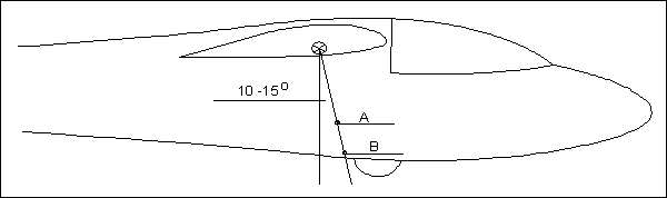 Zeichnen Sie eine Linie vom Schwerpunkt um 10 (bis 15) Grad bezogen auf die Lotrechte nach vorne. Für ein sicheres Abheben wählen Sie darauf den Punkt A . Wenn Sie das optisch stört, wählen Sie den Punkt B (Nachteil siehe unten). Auf jeden Fall wird je ein Haken links und rechts montiert. Dabei muß der Haken leicht nach hinten hoch zeigen, damit das Seil erst ausklinkt wenn es senkrecht nach unten zieht (oder leicht nach hinten - mit einer kleinen Schlaufe ausprobieren).