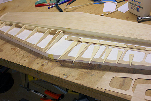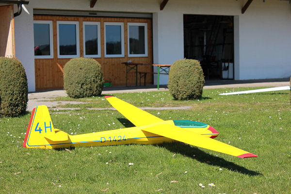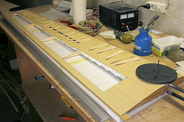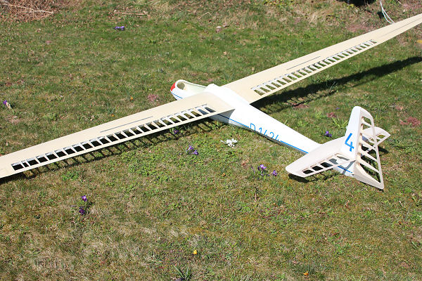 Bauweise : Corbon vollverstärkte Styro-Abachi Tragflächen mit eingesetztem Rippenfeld ; Carbon-Holm mit Holmbrücke.